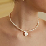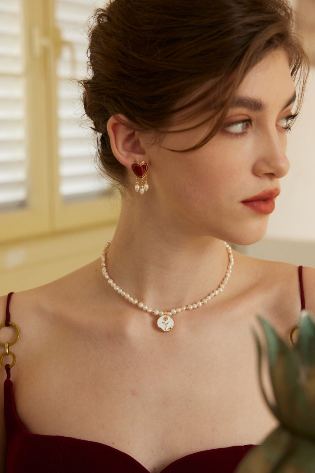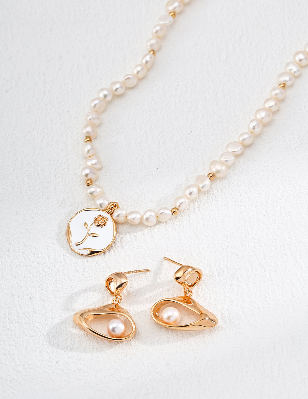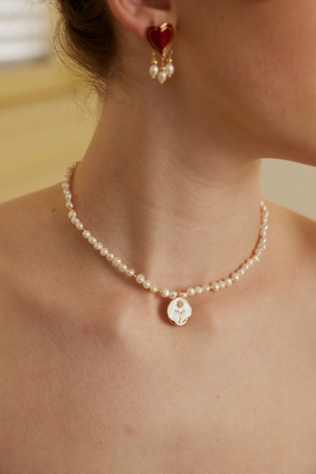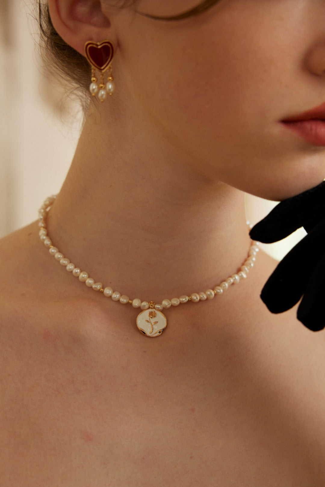 Pendant: Features a romantic rose-shaped pendant (approx. 2cm) with enamel details, accented by a 5-7mm natural pearl